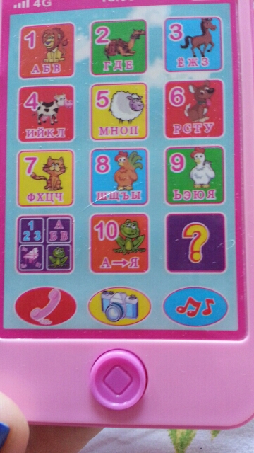 Батарейки не идут в комплекте, нужны 2 шт ААА. Всё на русском языке. Обучение цифрам, буквам, 10 песенок о животных, обучение пианино, 3 игры.